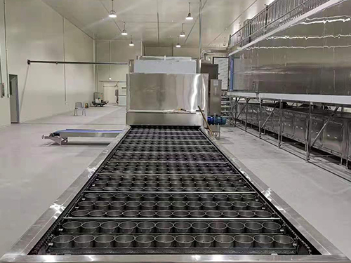工藝流程:預熱→螺旋攪拌(恒溫儲料)→真空攪拌→刮板下料成型→蒸熟(蒸汽)→冷卻→脫離→常溫老化→低溫老化(冷庫)→豎切絲→定量稱重-→裝碗→自動成型→連續(xù)性干燥→除潮→涼化→成品包裝。